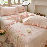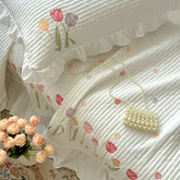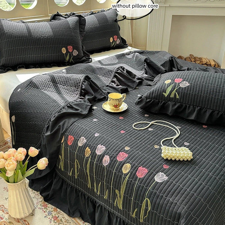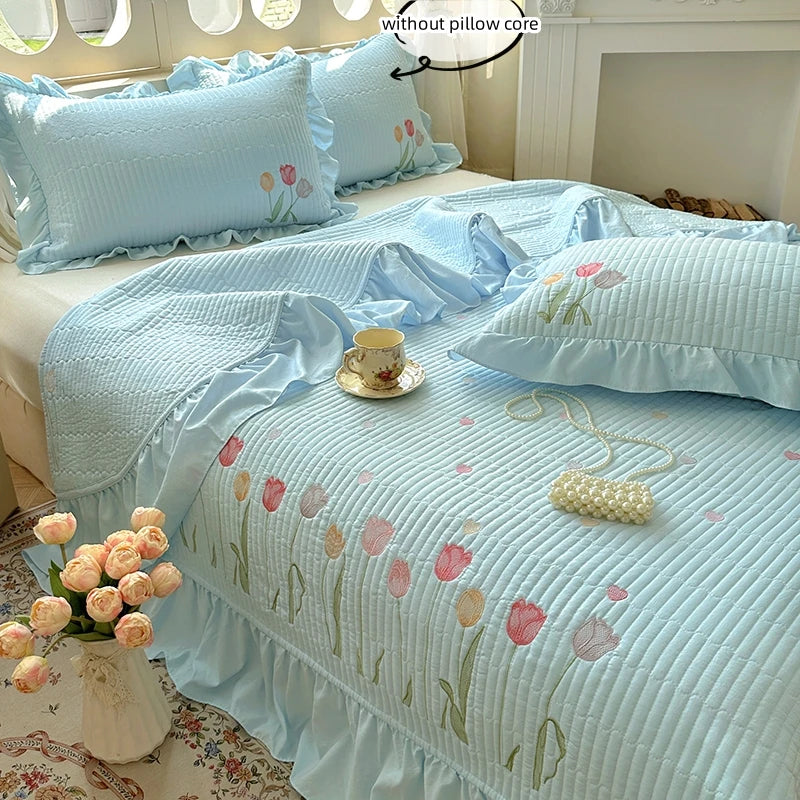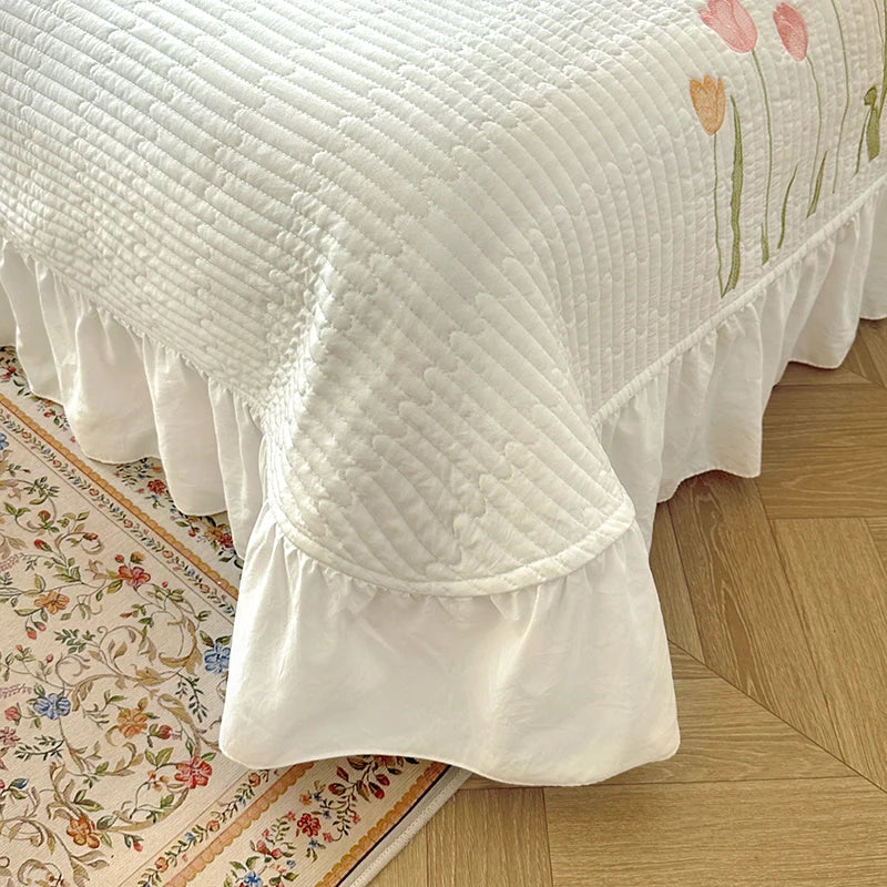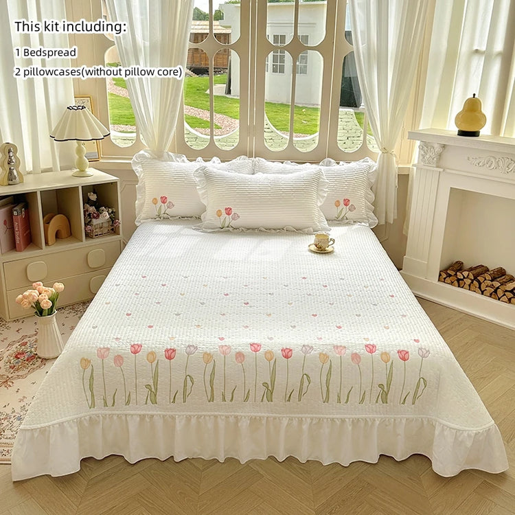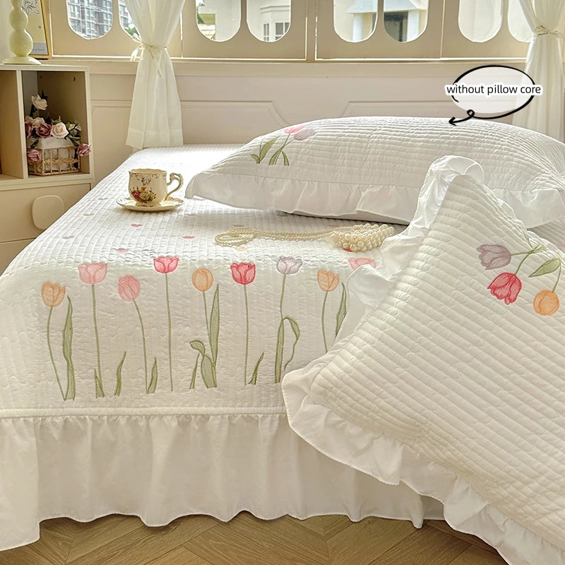 Quilt Bedding Set, Lightweight soft Bedspread with Embroidery Tulips for all Seasons 3pc